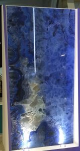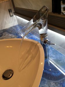 右側のブルーの特殊建材を初めて見たのがロンドンでの展示会。「いつかこれを使って家具を製作したい!」その思いを実現できたのがこちらの洗面化粧台です。海のイメージを更に引き立てたのがフィリップスタルクがデザインしたガラスの水栓。写真ではガラス部分から見える水流の美しさがお見せできないのが残念。
